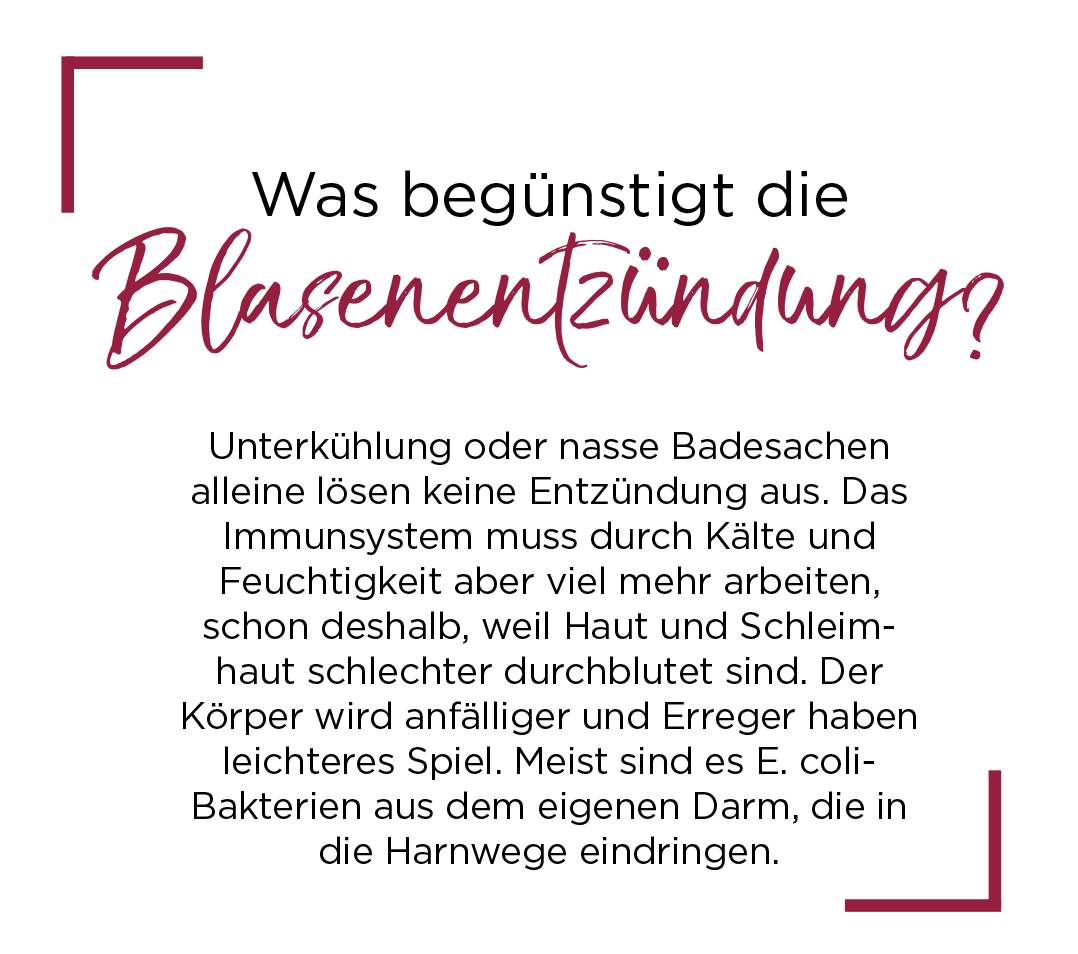 Durch Kälte allein entsteht keine Entzündung, sie kann aber dadurch begünstigt werden. In etwa 80 Prozent der Fälle sind es Kolibakterien, die aufgrund der Nähe von Harnröhre und Analregion aus dem Darm in die Harnröhre und darüber in die Blase gelangen. Frauen sind besonders oft betroffen, da die Harnröhre bei ihnen kürzer als bei Männern ist.