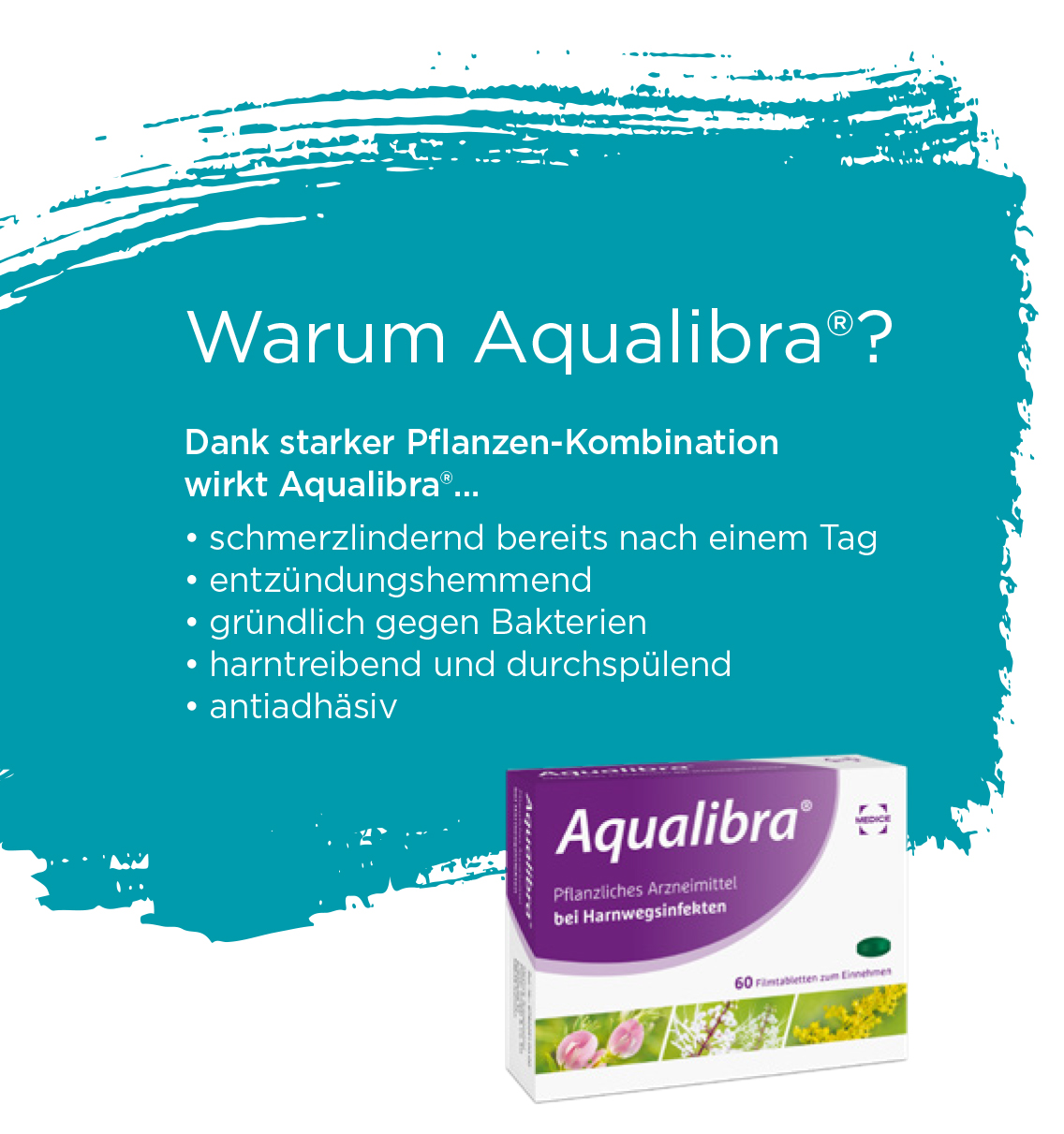 Da gibt es gute pflanzliche Therapieoptionen. Zum Beispiel Aqualibra®. Die Tabletten enthalten hochdosierte Extrakte aus Goldrutenkraut, Hauhechelwurzel und Orthosiphonblättern. Diese drei Heilpflanzen gegen Blasenentzündung kümmern sich um Erregerbekämpfung, Symptomlinderung, Durchspülung und Nachsorge und decken damit alle Behandlungsziele bei einer Blasenentzündung ab. Durch sogenannte antiadhäsive Eigenschaften können die Bakterien nicht mehr an der Schleimhaut andocken. Auch die Biofilmbildung, die „Schutzhülle der Erreger“, wird unterbunden. Das Risiko wiederholter Entzündungen kann damit reduziert werden.