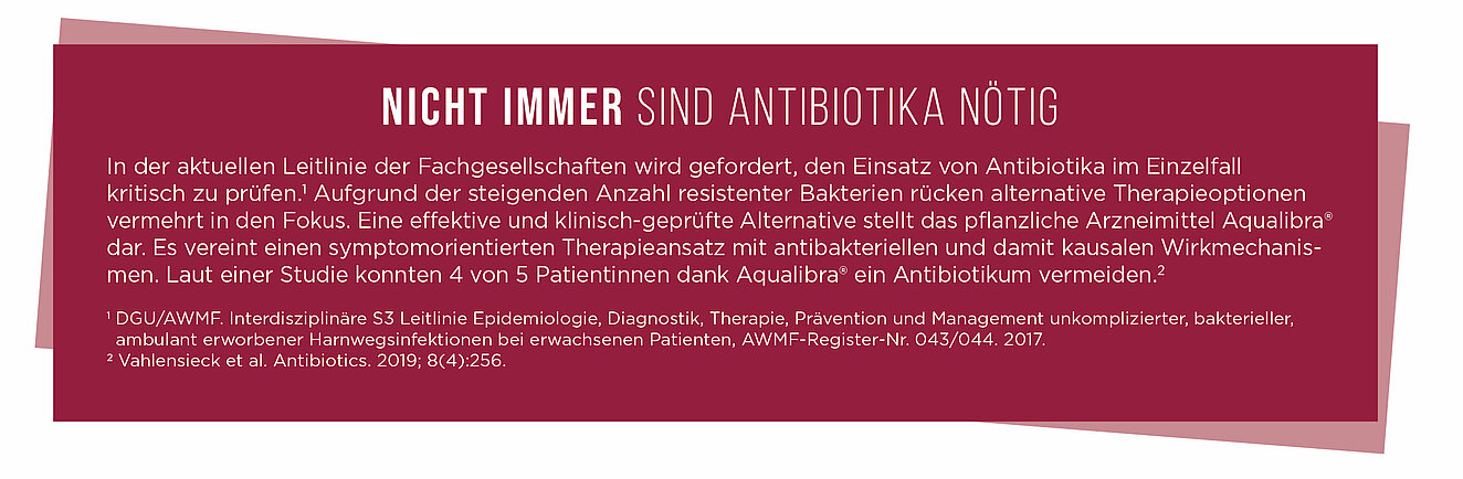 Wenn es bei einer unkomplizierten Blasenentzündung bleibt, können Blasenentzündungen häufig auch ohne Antibiotikum therapiert werden. Durch die frühzeitige Einnahme von Aqualibra® lässt sich die Behandlung mit einem Antibiotikum oft verhindern.1,2 Aqualibra® ist übrigens laut Studien auch sehr gut verträglich.1,2,3