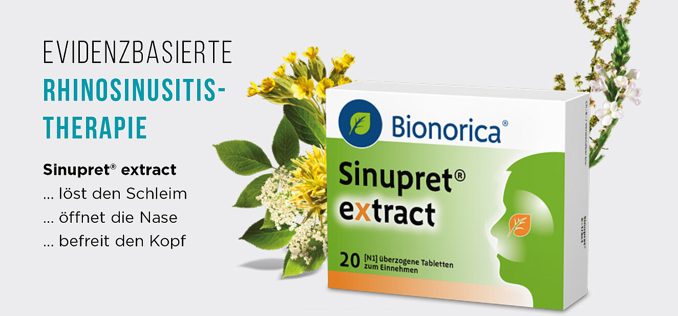 Sinupret® extract. Zusammensetzung: 1 überzogene Tablette von Sinupret extract enthält als arzneilich wirksame Bestandteile: 160,00 mg Trockenextrakt (3-6:1) aus Enzianwurzel; Schlüsselblumenblüten; Ampferkraut; Holunderblüten; Eisenkraut (1:3:3:3:3). 1. Auszugsmittel: Ethanol 51% (m/m). Sonstige Bestandteile: Glucose-Sirup 3,141 mg; Sucrose 133,736 mg; Maltodextrin 34,000 mg; Sprühgetrocknetes Arabisches Gummi; Calciumcarbonat; Carnaubawachs; Cellulosepulver; mikrokristalline Cellulose; Chlorophyll-Pulver 25% (E 140); Dextrin (aus Maisstärke); Hypromellose; Indigocarmin; Aluminiumsalz (E 132); Magnesiumstearat (Ph. Eur.) [pflanzlich]; Riboflavin (E 101); hochdisperses Siliciumdioxid; hochdisperses hydrophobes Siliciumdioxid; Stearinsäure; Talkum; Titandioxid (E 171). Anwendungsgebiete: Bei akuten, unkomplizierten Entzündungen der Nasennebenhöhlen (akute, unkomplizierte Rhinosinusitis). Sinupret extract wird angewendet bei Erwachsenen und Jugendlichen ab 12 Jahren. Gegenanzeigen: Überempfindlichkeit gegen den Wirkstoff oder einen der genannten sonstigen Bestandteile. Magen- und/ oder Zwölffingerdarmgeschwür. Keine Anwendung bei Kindern unter 12 Jahren. Keine Anwendung in der Schwangerschaft und Stillzeit. Patienten mit der seltenen hereditären Fructose-Intoleranz, Glucose-Galactose-Malabsorption oder Saccharase-Isomaltase-Mangel sollten Sinupret extract nicht einnehmen. Nebenwirkungen: Häufig Magen-Darm-Beschwerden (z. B. Übelkeit, Blähungen, Durchfall, Mundtrockenheit, Magenschmerzen). Gelegentlich lokale Überempfindlichkeitsreaktionen der Haut (Hautausschlag, Hautrötung, Juckreiz), systemische allergische Reaktionen (Angioödem, Atemnot, Gesichtsschwellung) und Schwindel. Warnhinweise: Wie alle Arzneimittel Anwendung in der Schwangerschaft und Stillzeit nur nach strenger Indikationsstellung.