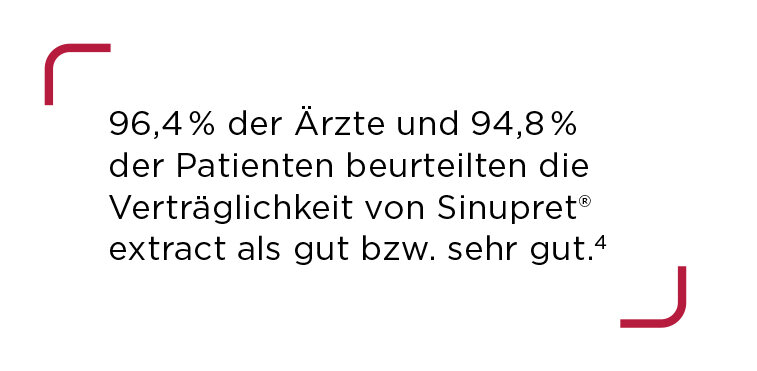Sinupret® extract ist sehr gut verträglich. Zu diesem Schluss sind sowohl die Patienten als auch die betreuenden Ärzte einer Studie gekommen.4 Dort konnte sogar gezeigt werden, dass es genauso gut verträglich ist wie Placebo.