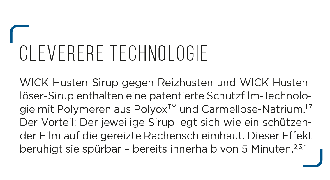 Ich empfehle Ihnen WICK Husten-Sirup gegen Reizhusten. Dieses Arzneimittel enthält den klinisch erprobten Wirkstoff Dextromethorphan. Er lindert den quälenden Hustenreiz schnell und reduziert die Hustenfrequenz zuverlässig für bis zu sechs Stunden¹. Da können Sie am Tag wieder aufatmen und nachts besser schlafen. Und das Präparat hat noch einen weiteren Nutzen: Es beruhigt die gereizte Rachenschleimhaut in fünf Minuten dank Schutzfilm-Technologie.2,3,*