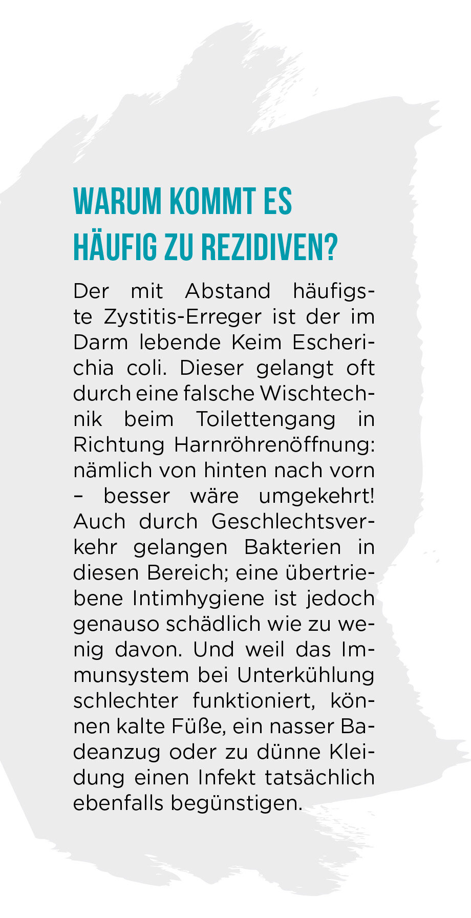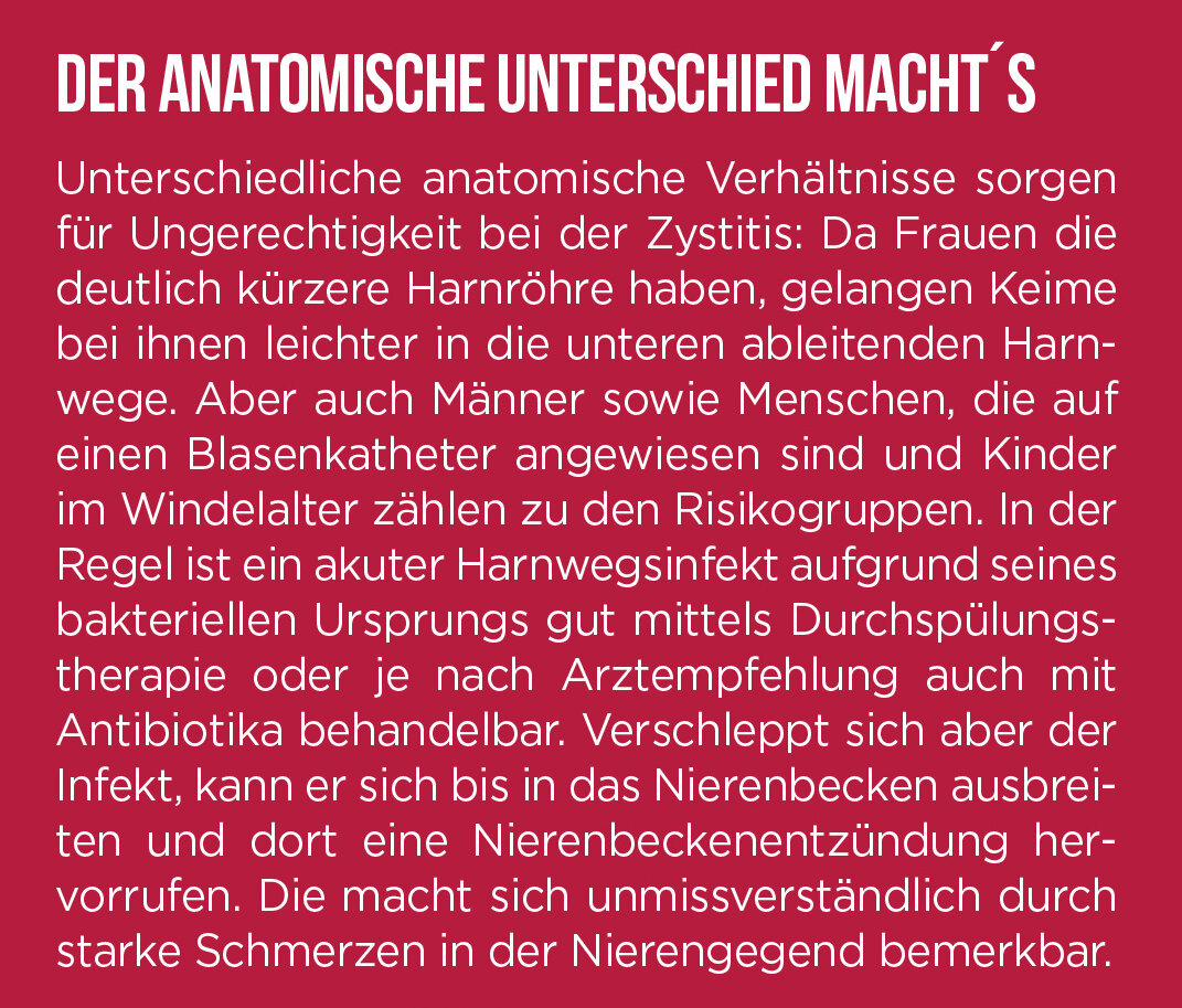 Ursache einer Blasenentzündung ist ja, dass Bakterien, die aus dem Darm stammen, in die Harnröhre gelangen und dort hochwandern, sich in der Blasenwand festsetzen und dort für eine Entzündung sorgen. Meistens heißt das Bakterium Escherichia coli, den Namen haben Sie bestimmt schon einmal gehört. Bei Frauen funktioniert das Einwandern der Bakterien besonders gut, denn ihre Harnröhre ist recht kurz. Das ist bei Männern anders, deshalb haben sie viel seltener eine Blasenentzündung als Frauen.