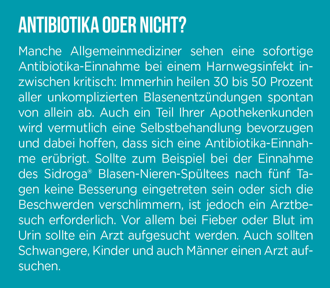 Das finde ich auch. Der Blasen-Nieren-Spültee kann auch eine Antibiotika-Therapie unterstützen. Es geht immer darum, die krank machenden Bakterien möglichst wirksam auszuspülen und gleichzeitig ein Aufsteigen in das Nierenbecken zu verhindern.